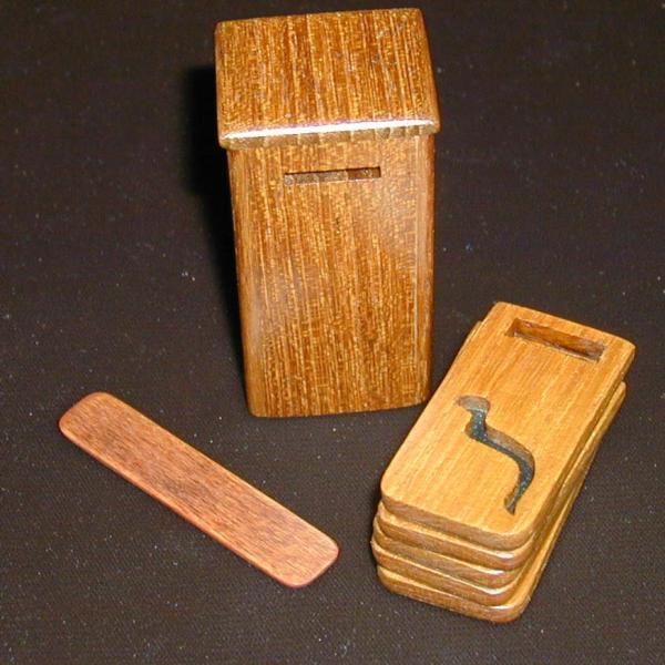 The spectator is given a free choice of one of the tablets. The five tablets are then stacked together and dropped into a small wooden cover which has a slot in two opposite sides of it. A narrow strip of wood is then passed through the cover via the slots, leaving a small portion of the wooden strip protruding from each side of the cover. The wooden strip also passes through the slots in the tablets so that when the cover is turned the right way up, the tablets are securely imprisoned inside it.